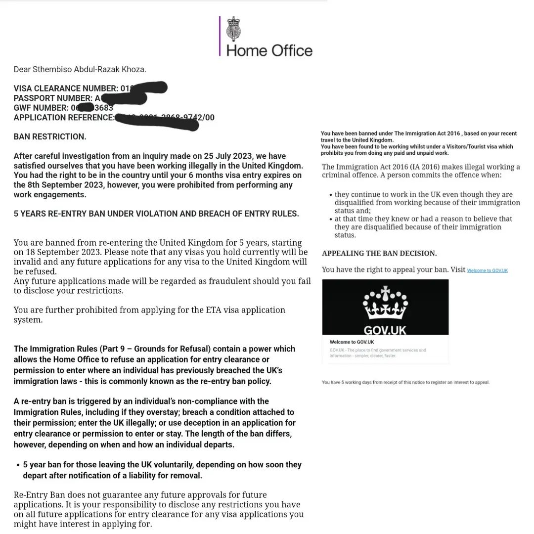 “You are banned from re-entering the United Kingdom for 5 years, starting from 18 September 2023. Please note that any visas you hold currently will be invalid and any future applications for any visas to the United Kingdom will be refused,” Khawula’s document read.