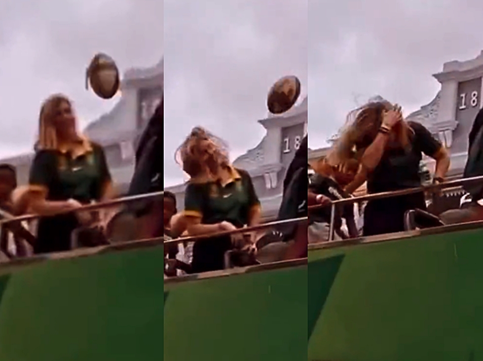 In other news – Watch: Siya Kolisi’s wife, Rachel hit with a rugby ball on her head while on Springboks parade bus