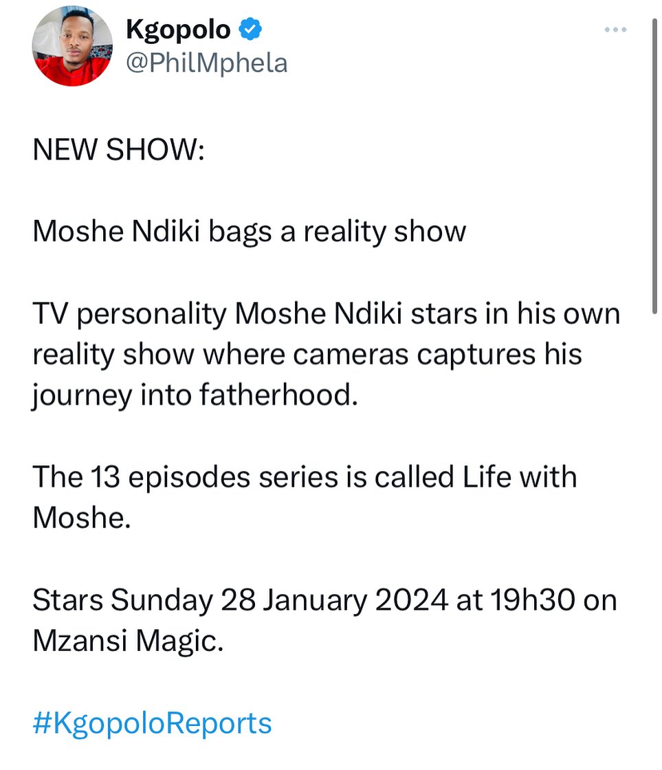 Moshe Ndiki bags a reality show TV personality Moshe Ndiki stars in his own reality show where cameras captures his journey into fatherhood. The 13 episodes series is called Life with Moshe. Starts Sunday 28 January 2024 at 19h30 on Mzansi Magic, Phil Mphela announced.